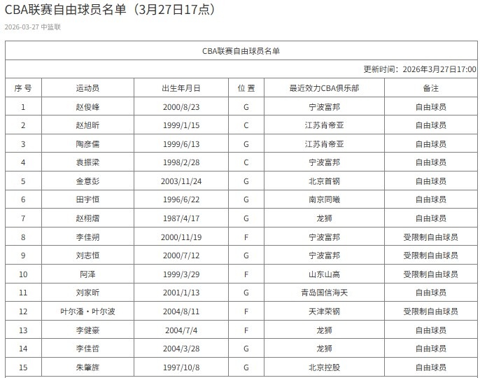 3月27日訊 今天,CBA官方更新了自由球員名單表。