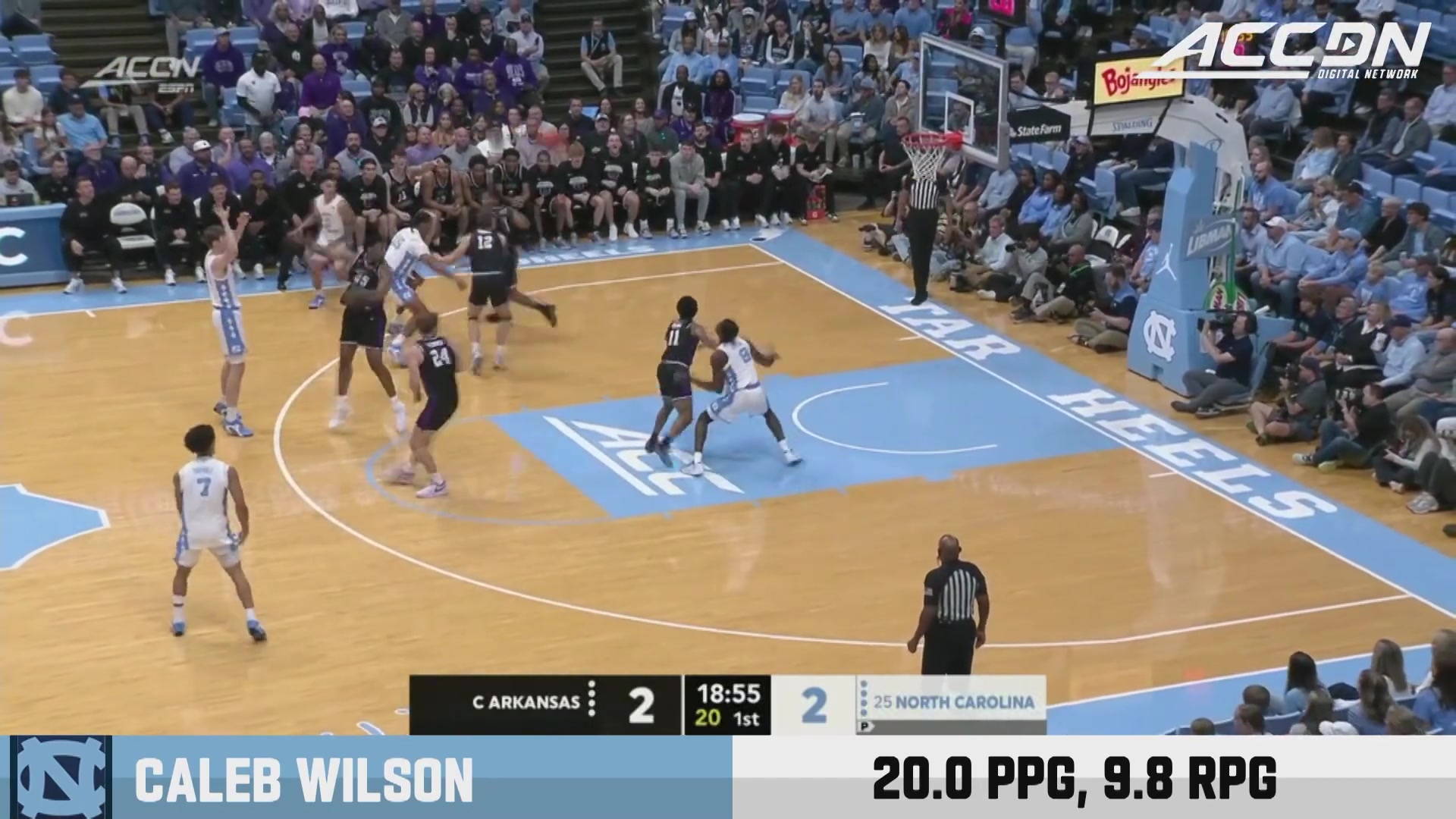 凱萊布·威爾遜現(xiàn)年19歲,身高2米08,體重97.5公斤,司職前鋒。本月,凱萊布·威爾遜因在訓(xùn)練中遭遇右手拇指骨折,接受手術(shù)賽季報銷,北卡在NCAA瘋?cè)涫纵喅鼍帧?/p>